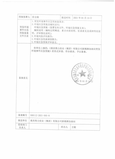 根据评估实施步骤和工作程序,重庆得力实业(集团)有限公司新溉路加油站于 2020 年 12 月委托三方公司承担“重庆得力实业(集团)有限公司新溉路加油站突发环境事件风险评估及应急预案”工作,根据国家相关法律法规与政策、评估指南要求以及加油站提供的相关资料,确定了评估工作的实施方案,进而开展现场踏勘、资料收集整理、对加油站范围内存在的风险源进行调查,遵照相关法律法规及其他相应的突发环境事件风险评估推荐方法的要求,最终编制完成了《重庆得力实业(集团)有限公司新溉路加油站突发环境事件风险评估报告》,报告内容评估出新溉路加油站涉及突发环境事件的风险单元为储罐区、加油区、泄油区、危废间,评估结果为一般风险。